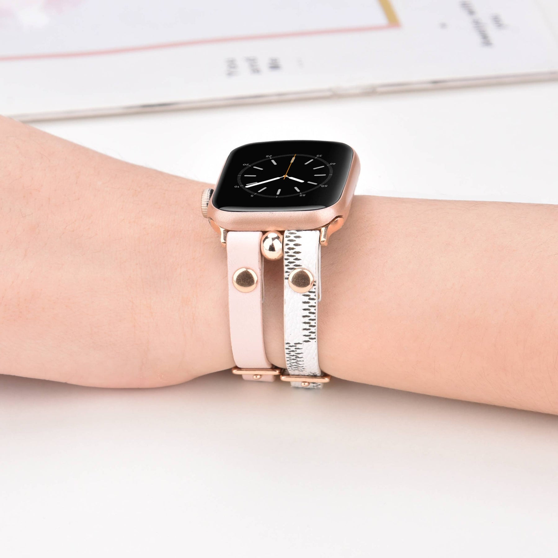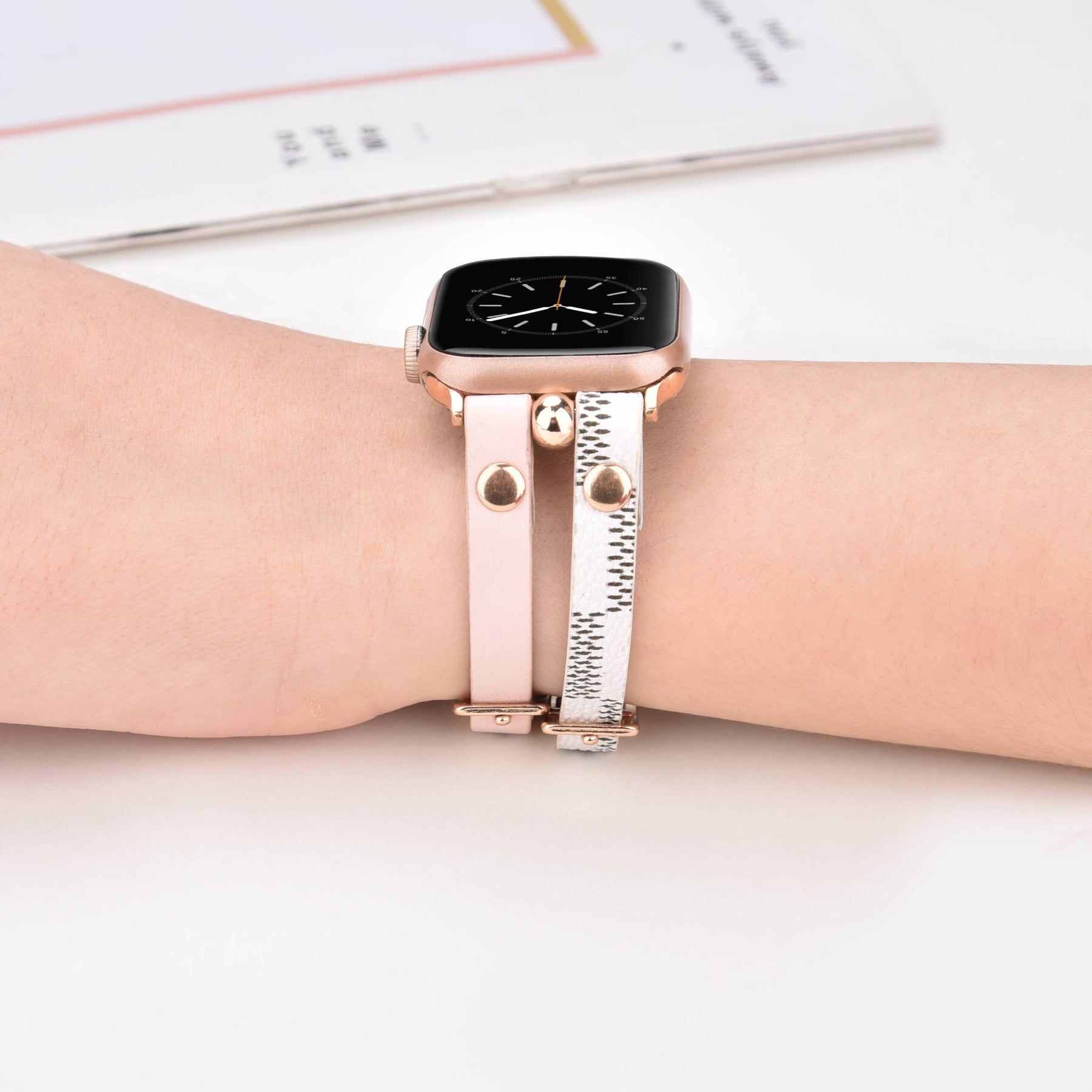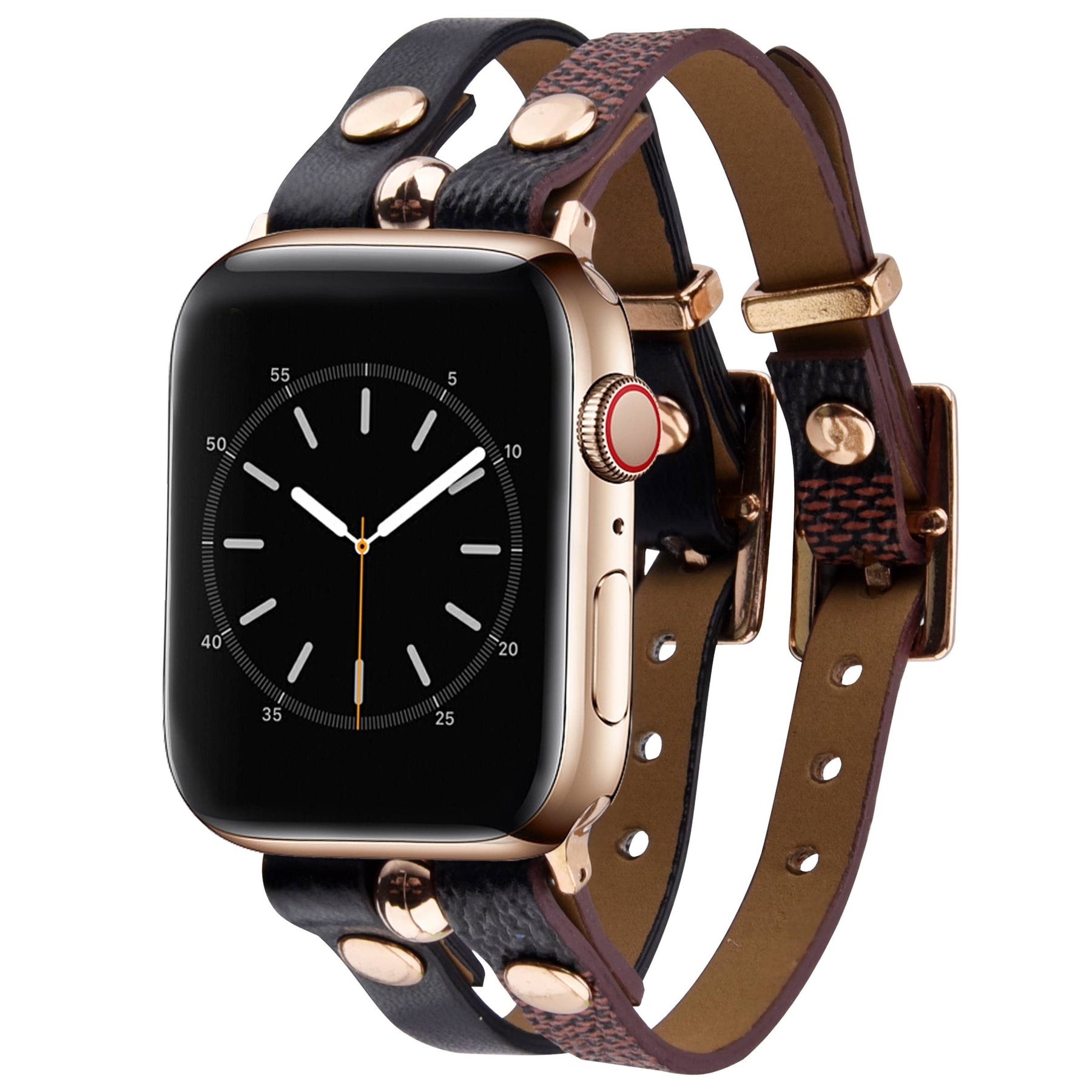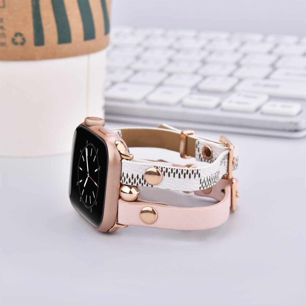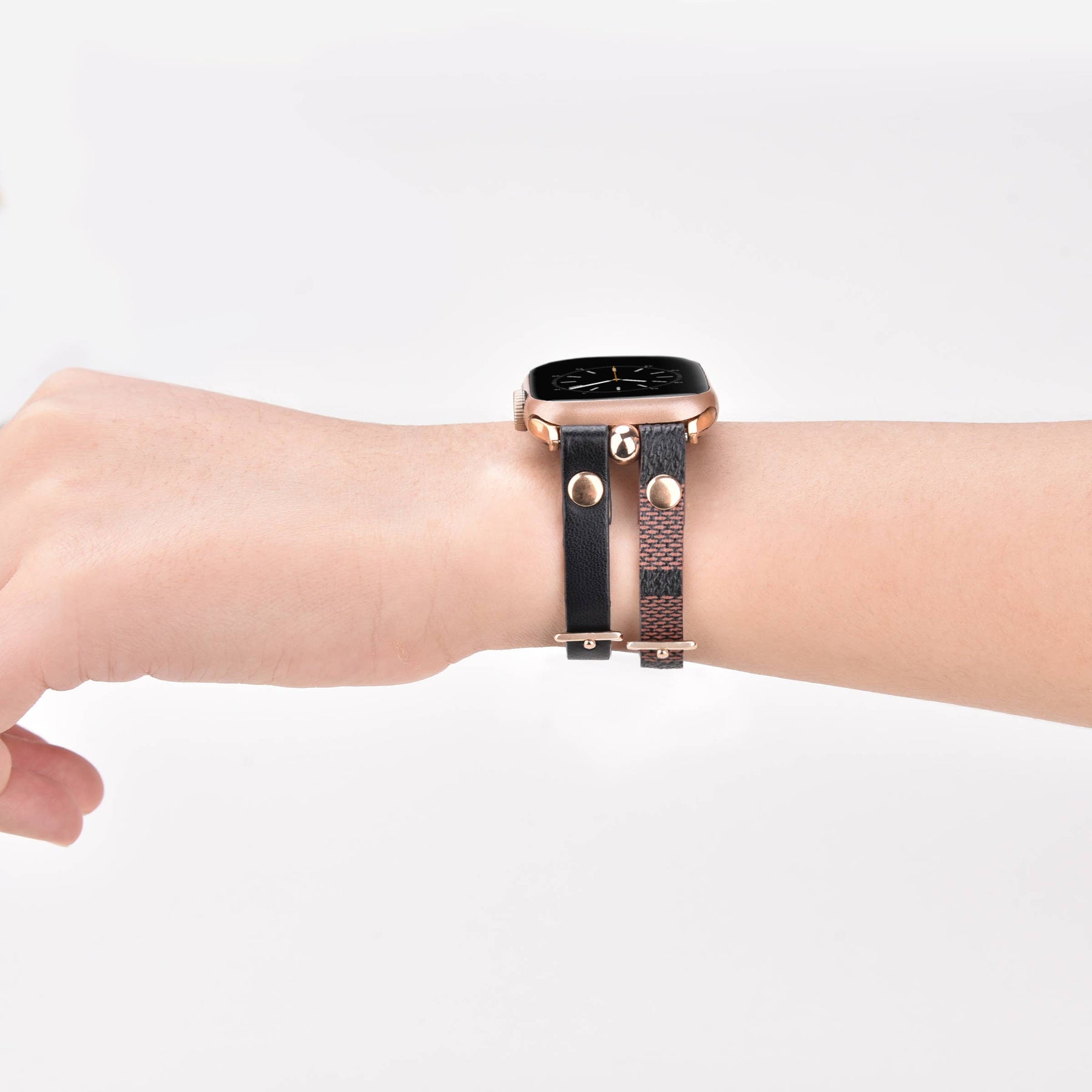 This Damier (checkerboard) band has gold accents, is made with vegan leather, and has an adjustable buckle with gold accents. Fits a wrist as small as 5 inches to 8 inches. This band is stunning guys, it makes the perfect gift.