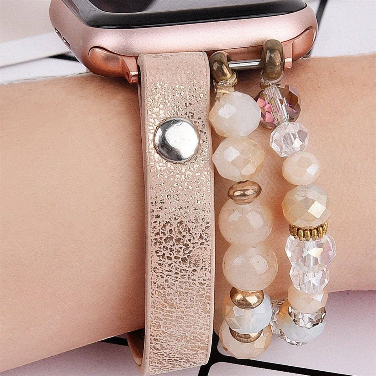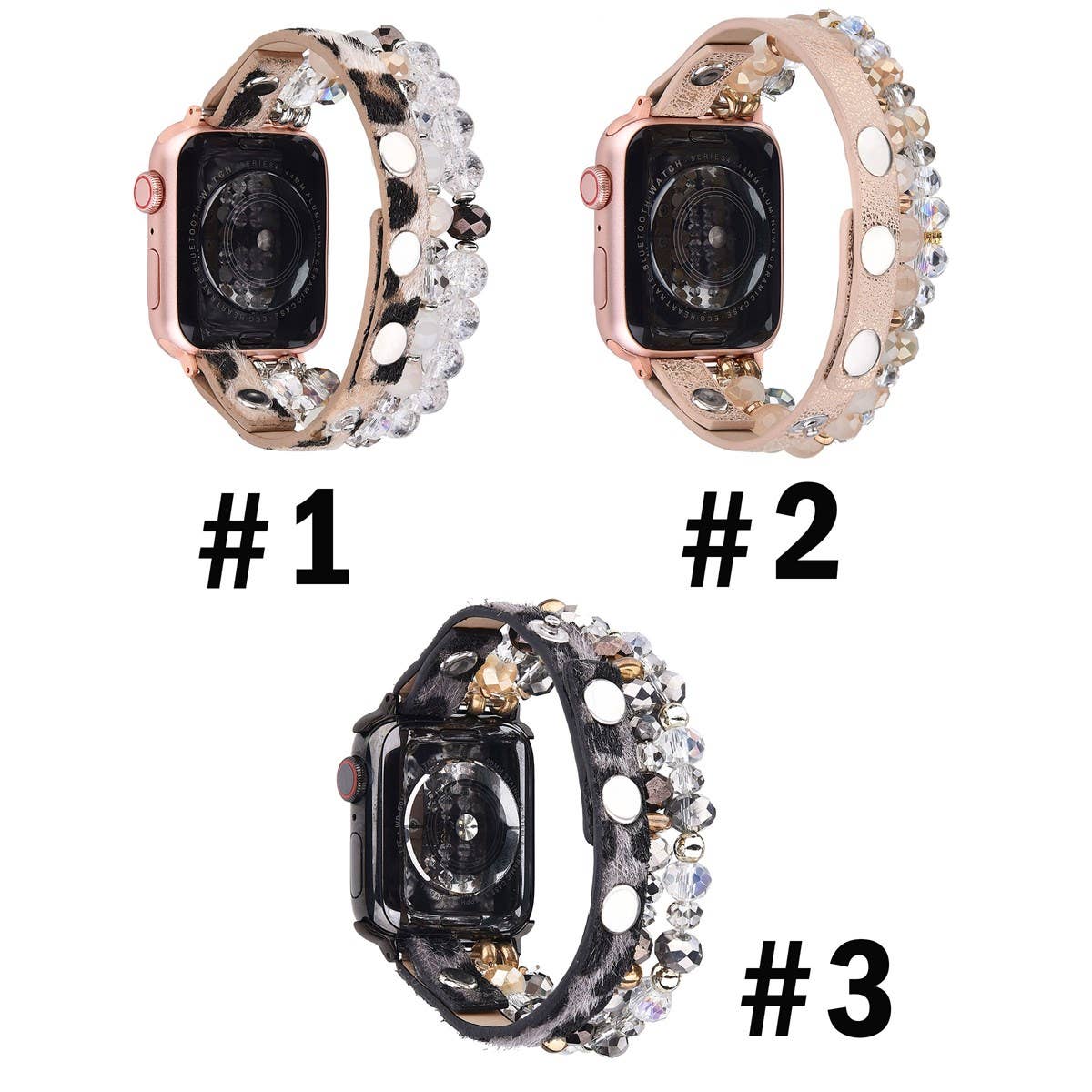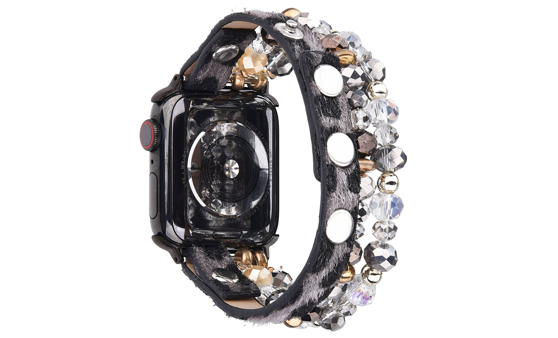 Introducing our new Apple watch beaded bands! These Apple watch bands will go perfect with any outfit on a beautiful day! Leopard printed faux calf leather and crystal beaded stretch multi-layered Apple watch band.